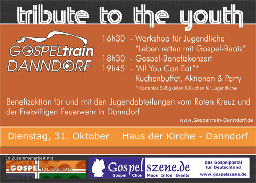Ab 16.30 Uhr findet für alle Jugendliche im Danndorfer Haus der Kirche zusammen mit den Konfirmanden der Workshop "Leben retten mit Gospel-Beats" statt, welcher von Initiator Arjan Leuschner geleitet und von den Jugendgruppen durch spannende Aktionen ergänzt wird. Die Ergebnisse werden im Gospel-Benefizkonzert ab 18.30 Uhr vorgestellt. Musikalisch wird der Gospeltrain Danndorf stilistisch vor allem jugendlichen "Urban Gospel" im Repertoire haben. Damit wird der fast 500 Jahre alten evangelischen Kirchenform – welche einst über die Thesen Martin Luthers entstand – neue Frische verliehen und ein neuer Akzent gesetzt.